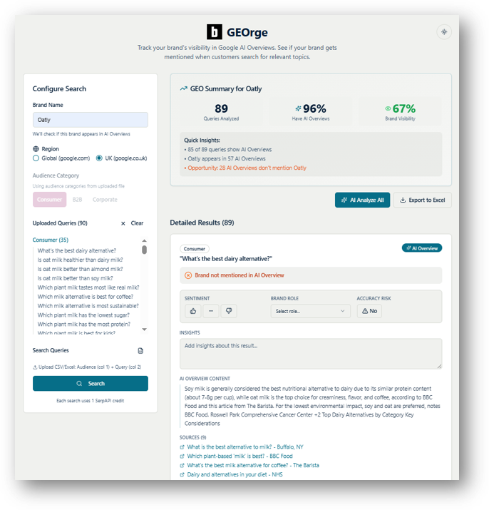 Access to GEOrge© for first-level Generative Engine Optimisation (GEO) analysis is provided to clients as part of a retainer or project scope with Blurred. Non-clients can get in touch or register interest here.
