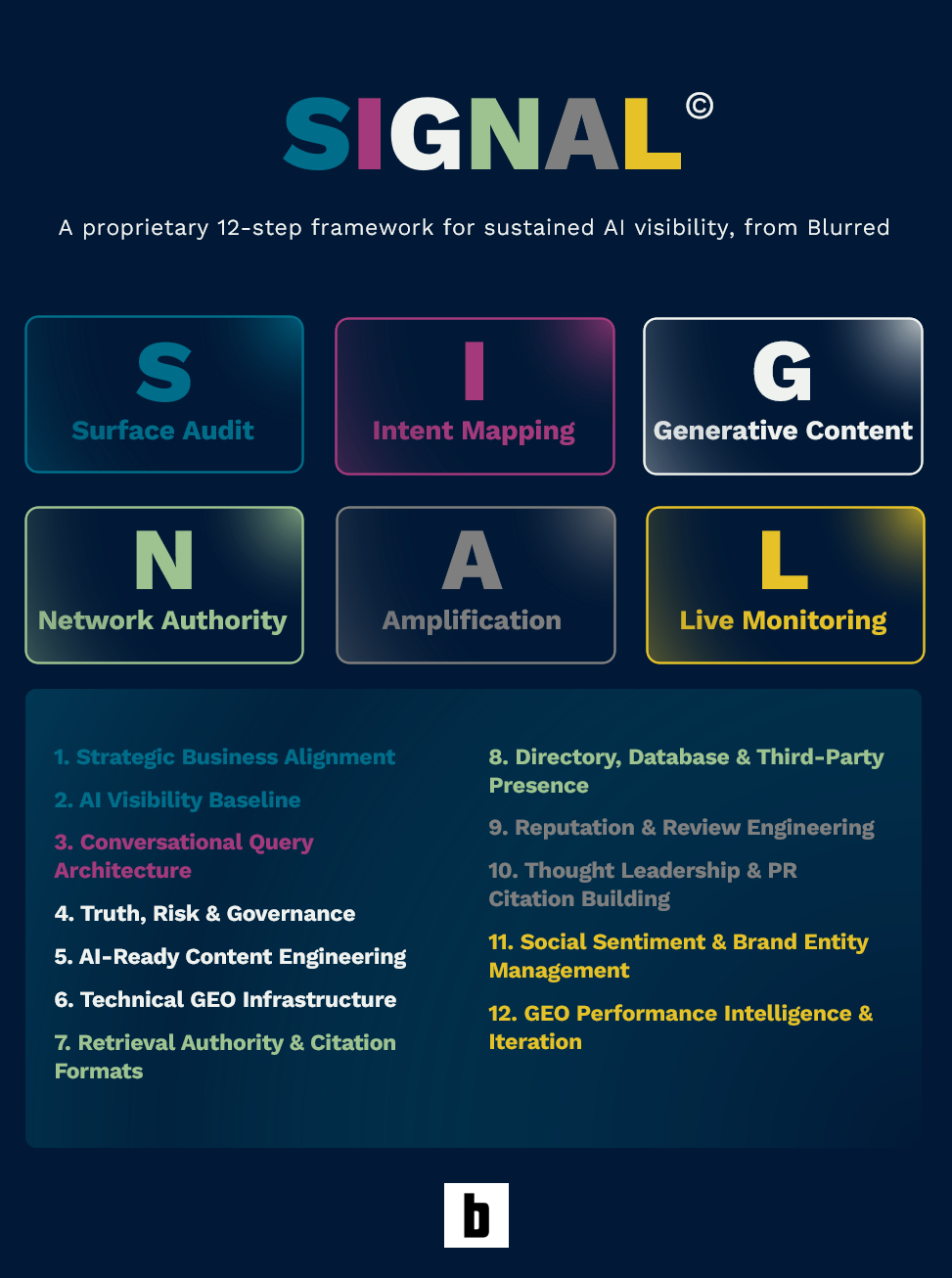 The SIGNAL Framework™ is Blurred’s proprietary 12-step methodology – synthesised from leading academic research, platform-level guidance from Microsoft and Google, and the deepest empirical studies of LLM recommendation algorithms available. It is structured into five operating phases: Foundation, Audit, Build, Amplify, and Sustain.